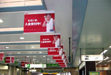 懸垂幕はビル、百貨店など高い建物に専用の装置を付けて掲出すし、商品、セールス、プロモーション、イベントの訴求に効果的な広告ツールです。